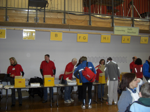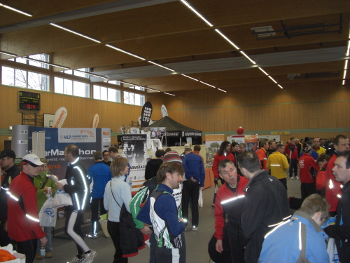 ... und eine kleine Marathonmesse untergebracht sind. Am Ende der Halle gibt es schon vor dem Lauf die Finisher-Funktionsshirts. Damit wir
