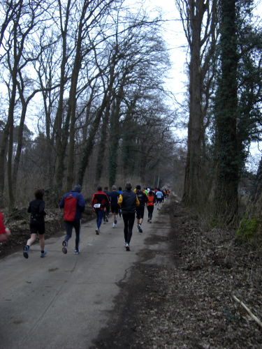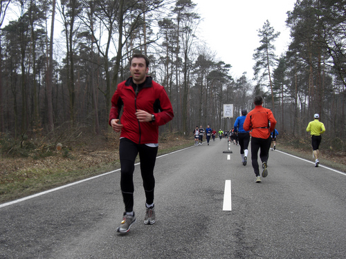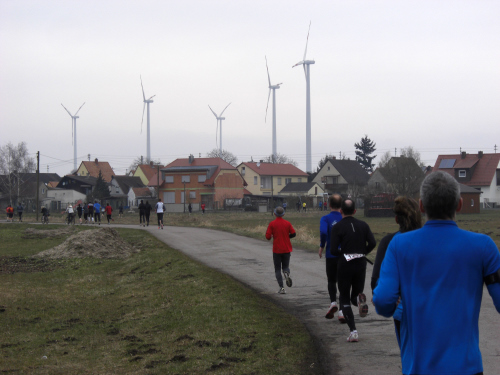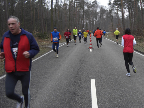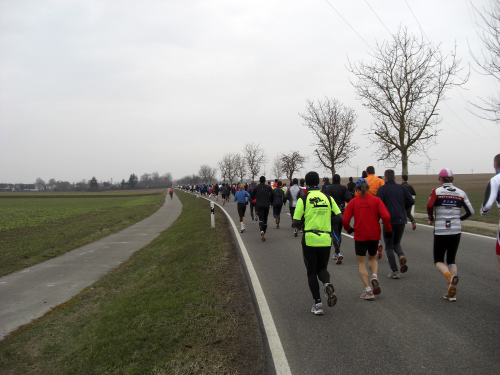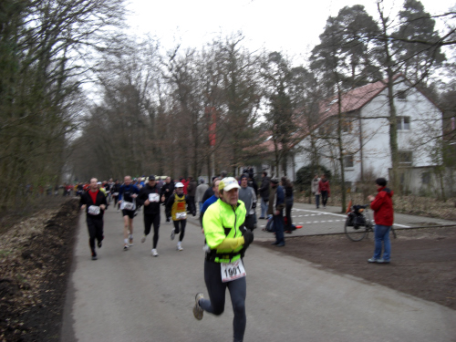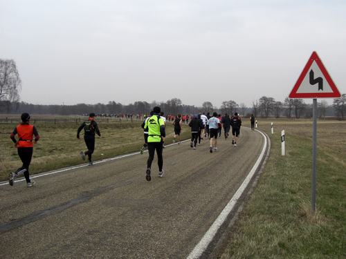 Die Marathonis müssen hier geradeaus weiterlaufen. Wir Halbmarathonis dürfen wenden und uns auf den Rückweg machen. |