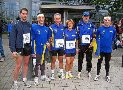 unserem anderen Dieter verwechselt zu werden), Oliver, mich, Marianne, Dieter und Jens (v.l.n.r.). Dieter2 hatte sich für diesen Tag eine Zielzeit von 3:15 vorgenommen, Oliver und Jens liefen ihren ersten Marathon,