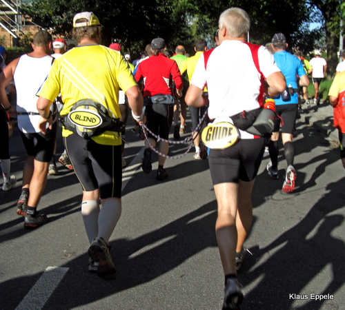 Nach ca. einem Kilometer überhole ich einen blinden Läufer, der es wohl insbesondere auf den letzten, doch etwas unwegsameren Kilometern