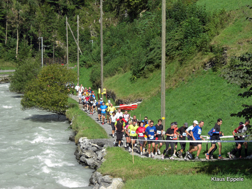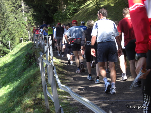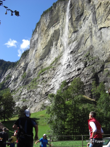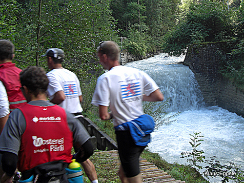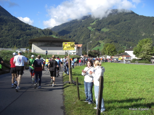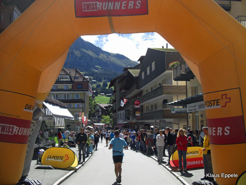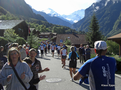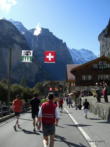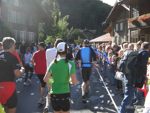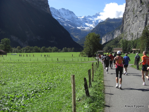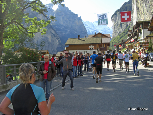 Ich laufe durch Lautbrunnen, vorbei am Staubbachwasserfall zur Halbmarathon-Meßmatte, die ich 2:04:57 Stunden nach dem Start überquere. |