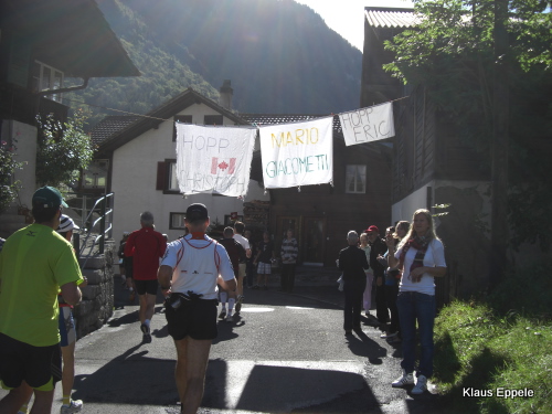 Nach knapp 20 Kilometern erreichen wir Lauterbrunnen, wo mich Johannes, der Freund von Bille, die heute auch den Marathon läuft, wild winkend