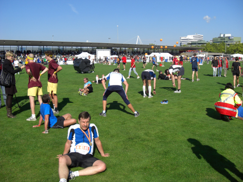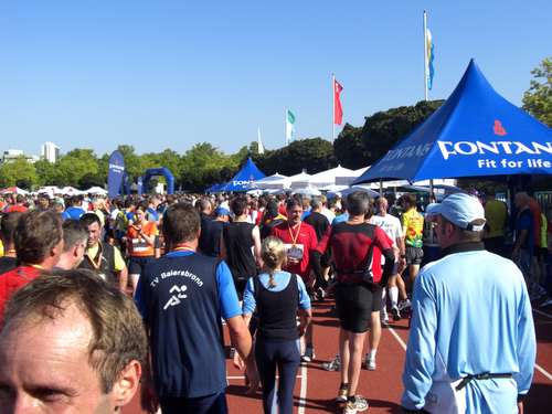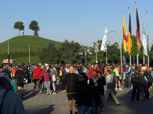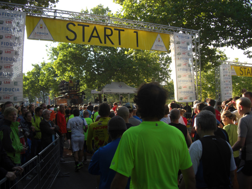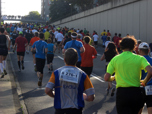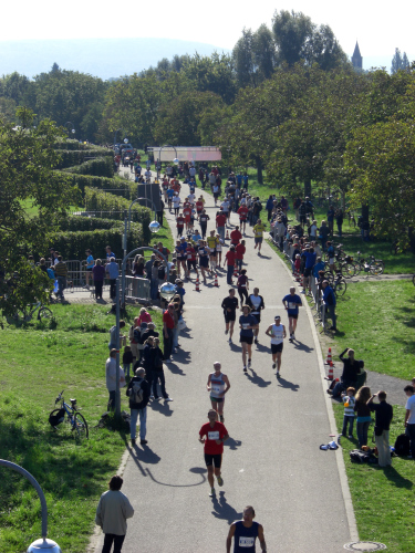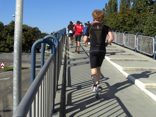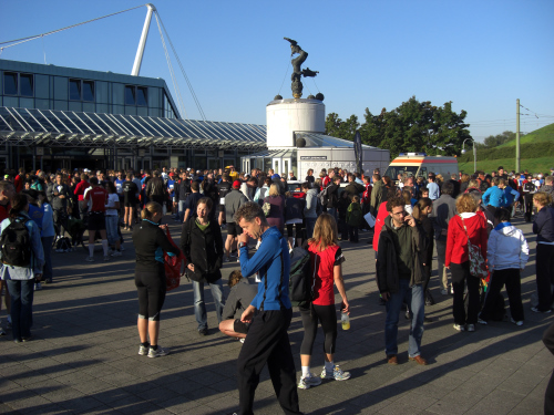 der Bannwaldallee und erreiche über die Straßenbahnbrücke das Start-/Zielgelände, wo sich schon einige Läuferinnen und Läufer warm laufen. |