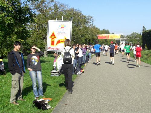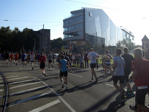Die nächste Fankurve erreichen wir nach ca. 9,5 km Wegstrecke beim Firmengebäude des Baden-Marathon-Hauptsponsors Fiducia. Kurz darauf