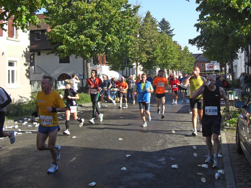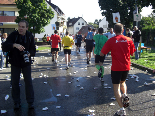 In Rüppurr - an der dritten Verpflegungsstelle - greife ich mir zum ersten Mal einen Becher Wasser. |