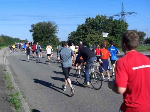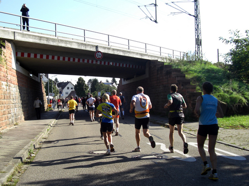 Auf dem Weg durch den Oberwald geht es wieder recht eng zu und überholen ist kaum möglich. Aber hier in Rüppurr hat sich das Läuferfeld wieder