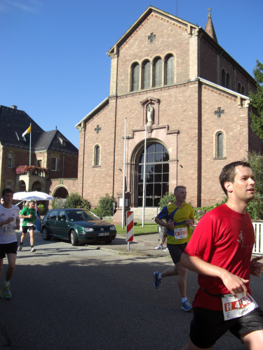 Hier in Weiherfeld spricht mich Bernd an (der in den roten Laufklamotten). Er ist ganz euphorisch, weil es bei ihm heute so gut läuft, und er