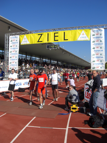 Dieter hat mich auf den letzten Metern überholt und kommt zehn Sekunden vor mir an. Marco verfehlt ganz knapp die 1:45. |