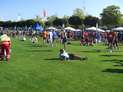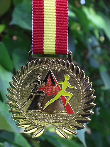 ... die schöne neue Medaille bereits um den Hals hängen habe und nicht noch weitere 21,1 km laufen muss. Mein Garmin zeigt übrigens eine
