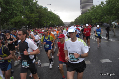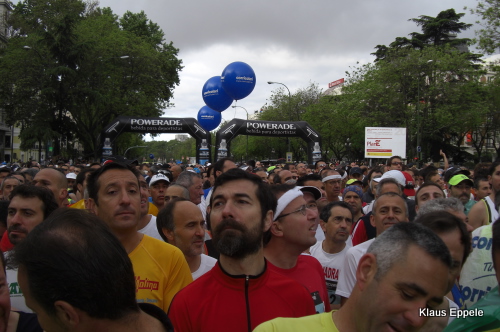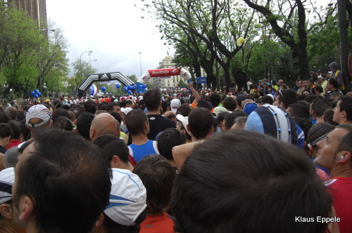 ohne Frühstück und ohne die sonst üblichen Marathon-spezifischen Vorbereitungen. Ca. 20 Minuten später komme ich zum Startbereich auf dem Passeo de Recoletos und mische mich wegen der niedrigen Temperaturen