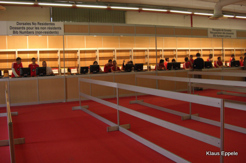 ... wo man heute nur wenige Läufer antrifft. Gleich neben dem Eingang erhalten wir ohne Wartezeit unsere Startnummern und die Einmal-Chips zur