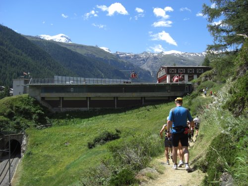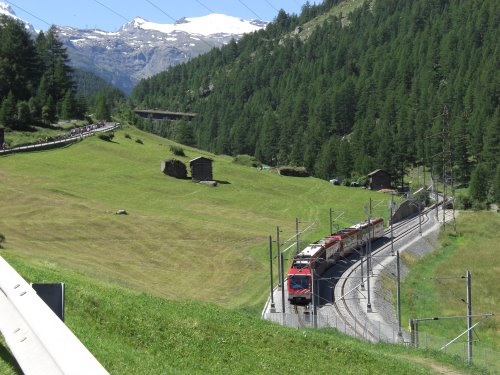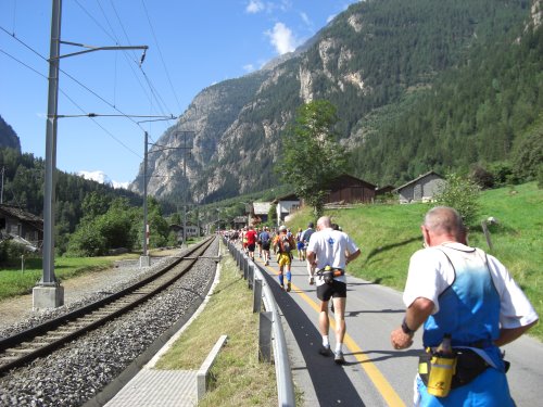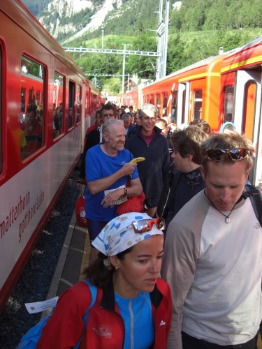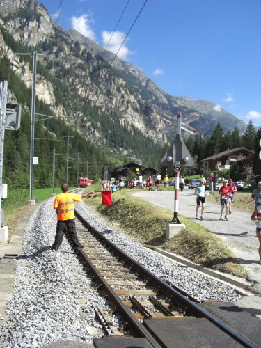 Niklaus die “Fahrende Tribüne”. Das ist ein Sonderzug, der die Begleitpersonen der Läufer zurück nach Zermatt bringt und wohl an den Stellen, an denen man die Läufer sehen kann, extra langsam fährt. |