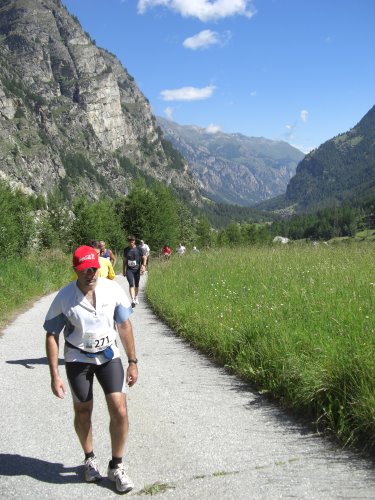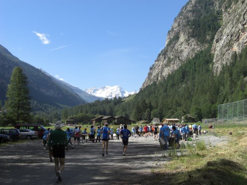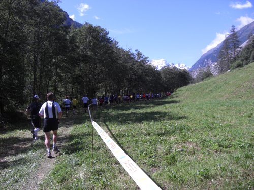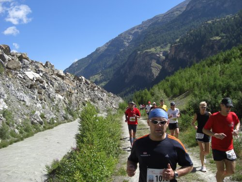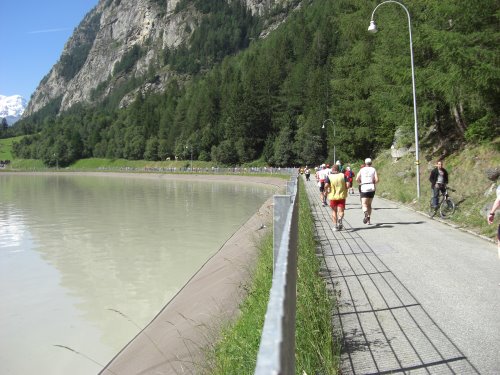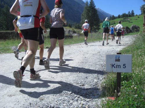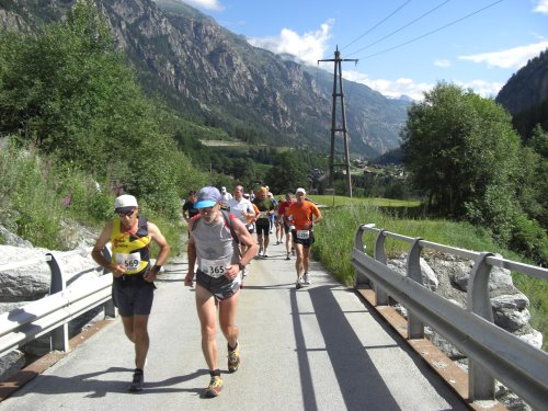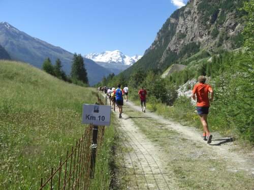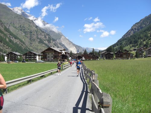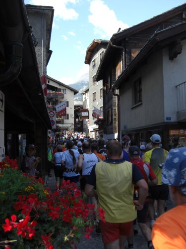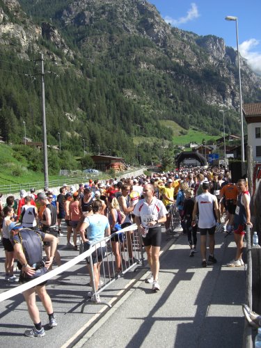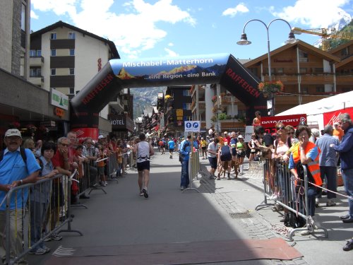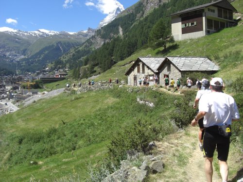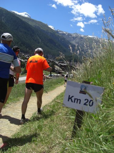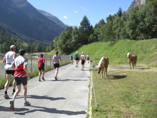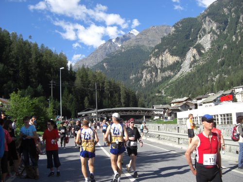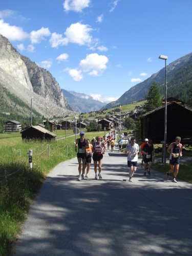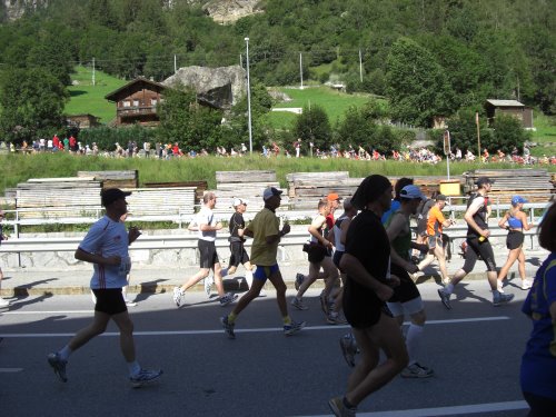 nur bis Zermatt laufen müssen, und zwei Minuten danach, also um 9.37 Uhr, können dann die restlichen Läufer lostraben. Ich verbringe die Wartezeit auf irgendeinem Schattenplätzchen, weil die Sonne schon ganz