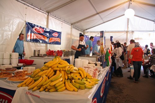 Und am Abend besuchen wir die Barilla-Nudelparty vor dem Bahnhof in Zermatt. Nudeln mit Käse- oder Tomatensauce bis zum Abwinken plus eine Banane kosten 9,50 schweizer Franken. |