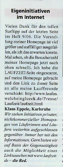 Laufzeit (Ausgabe 10/2006, Seite 6)Ich habe mich per E-Mail für den Surftipp in der Ausgabe 09/2006 bedankt - und bin überrascht, den Text der E-Mail in der nächsten Laufzeit-Ausgabe zu finden.Siehe auch Laufzeit. zurück
