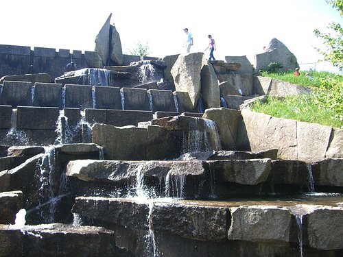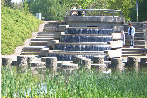 ... laufen an einem kleinen künstlichen Wasserfall vorbei und |
